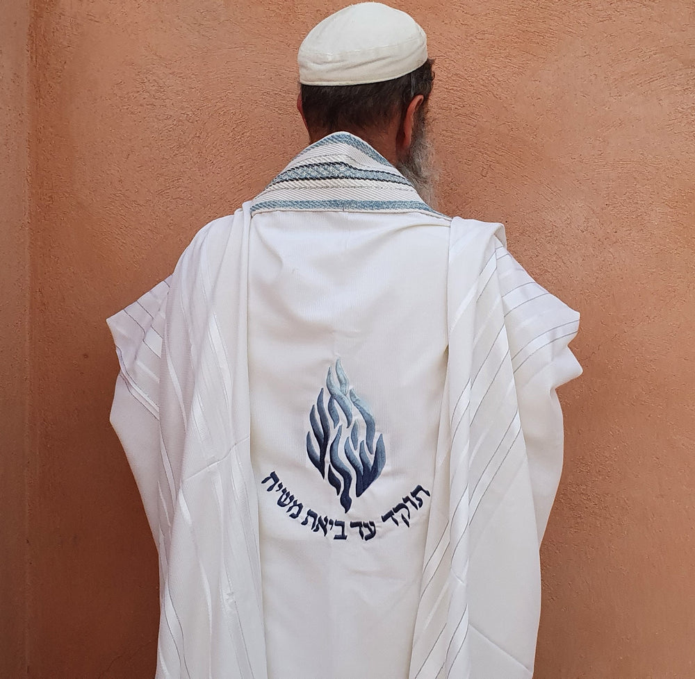 טלית צמר של משכן התכלת בדוגמה לבנה עם עטרה וכנפות בעבודת יד בגוונים של כחול וכסף. בגב הטלית רקמת האש שלי תוקד עד ביאת משיח. .