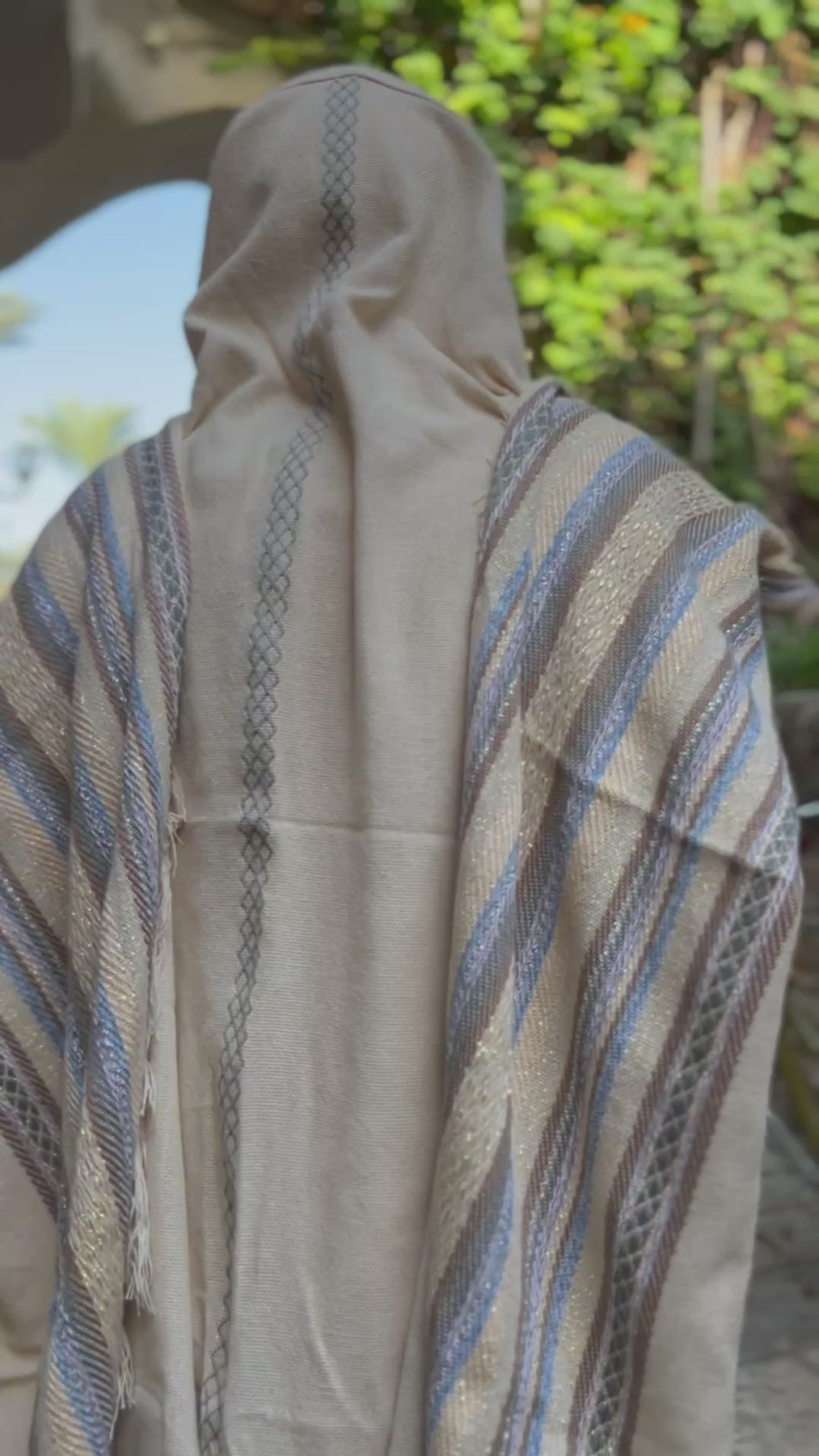 טלית העשויה מחוטי כותנה טבעית, רכה ואיכותית, המשלבים צבעי חום, שמנת, תכלת, זהב ולבן.